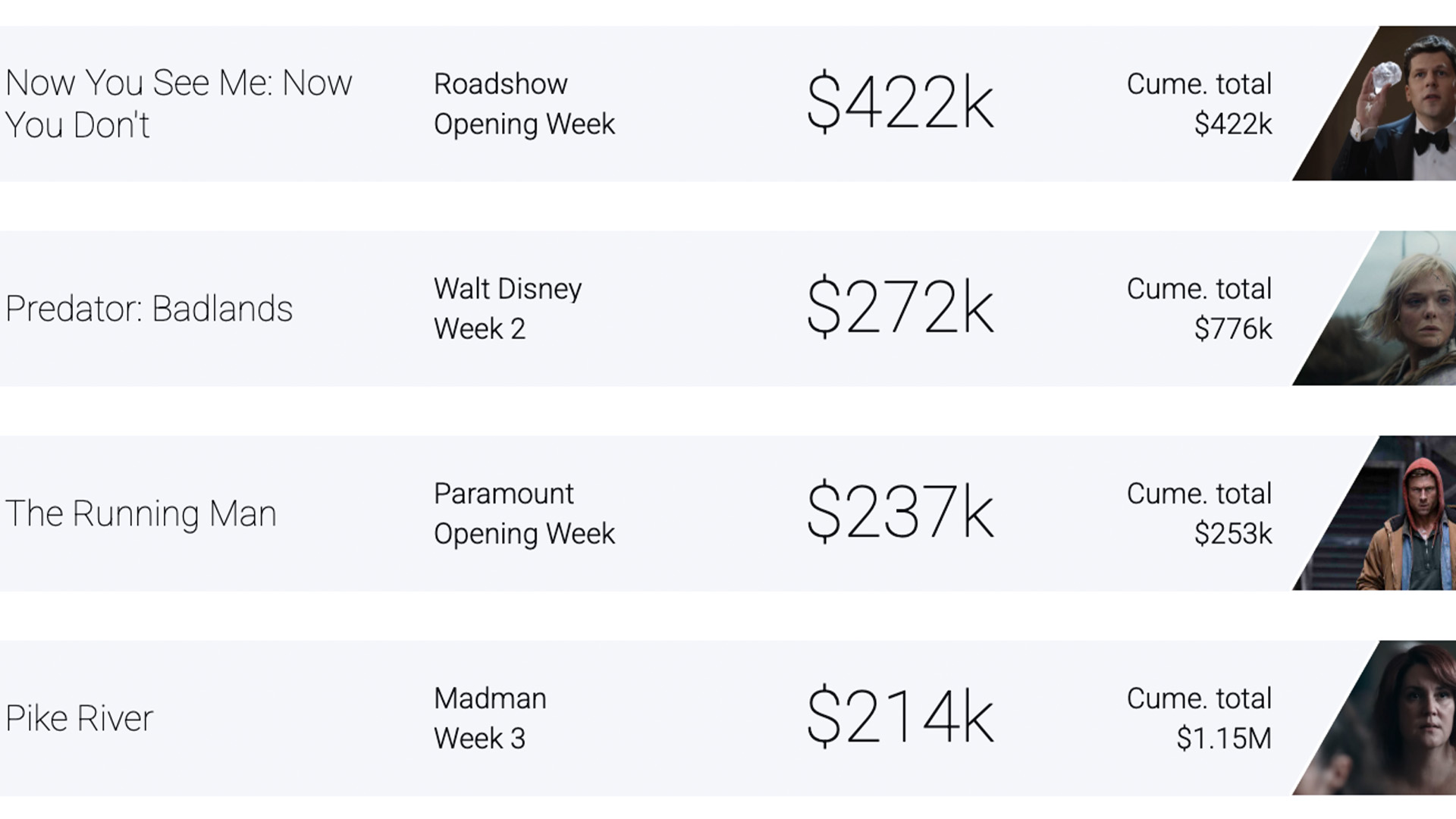 Back for a third helping of box office magic, Now You See Me: Now You Don’t makes bank while finally making good on the punny potential of its title (this is what the second film shoulda been called though, really). Predator: Badlands just beat Edgar Wright’s new take on The Running Man by a nose as the two action sci-fi pics dueled for second place, while Aotearoa true story Pike River is only just off the pace in fourth spot.