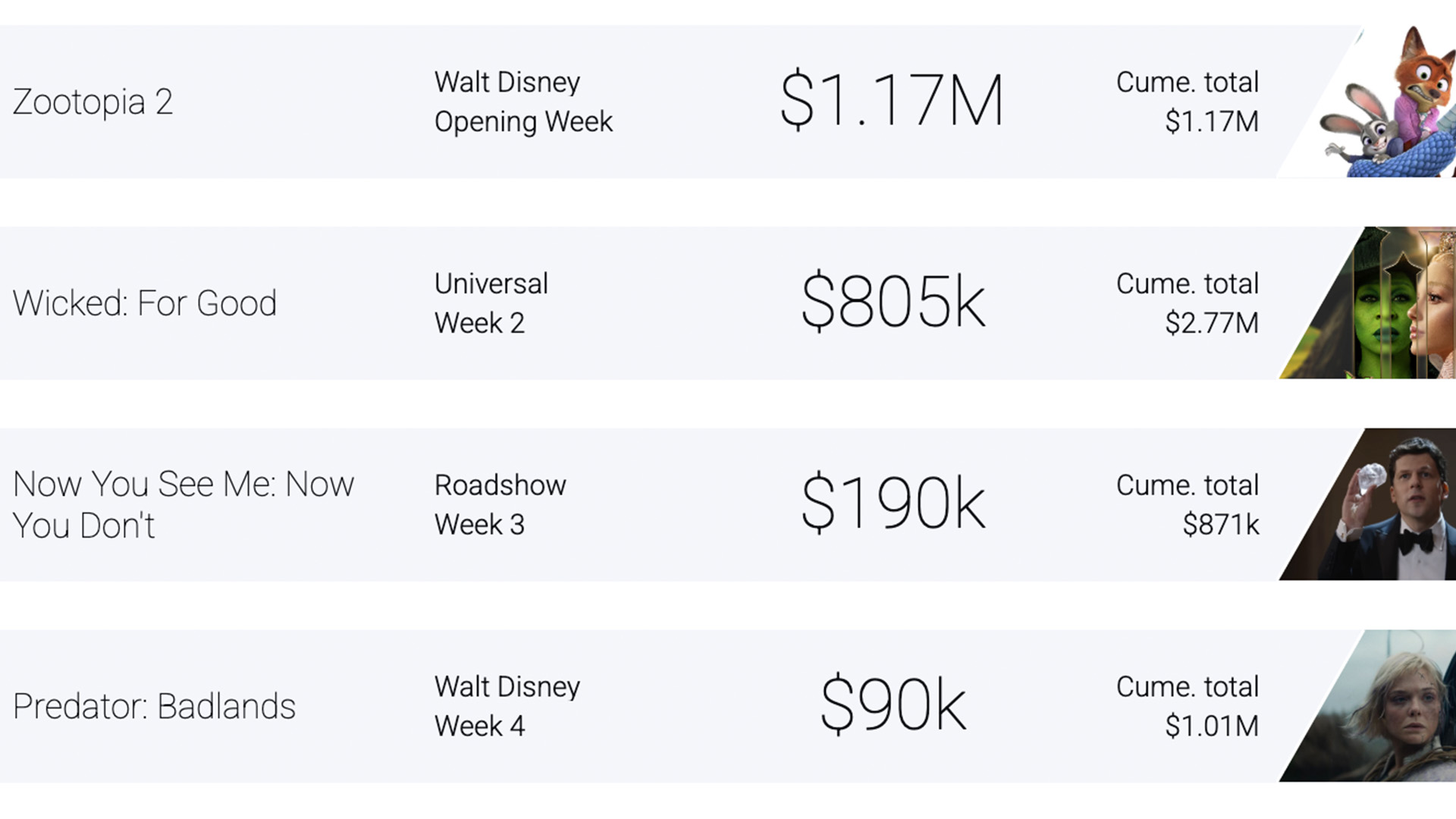 1. Zootopia 2 (Walt Disney) $1,167,022 (new release)
