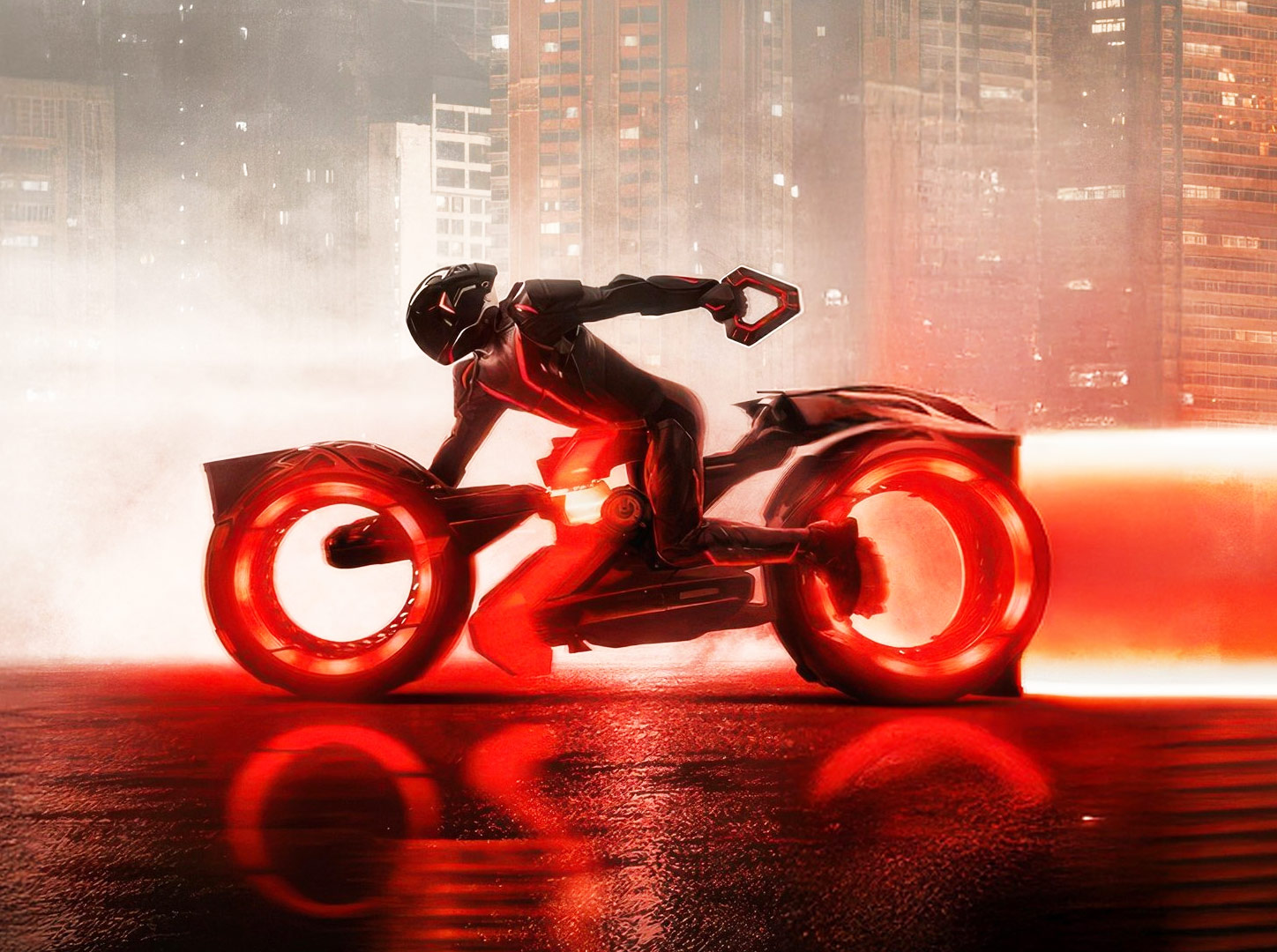 Tron: Ares has a great time revelling in that overlap. One its centerpiece chase scenes begins with Eve hopping on a Tron bike, which surrounds and attaches itself to her: a transhuman image, person and machine as one, and also a reality-hopping machine: once digital, now physical. Then she fangs it like a bat out of hell, charging through the city with another Tron bike in hot pursuit, creating a trailing barrier of light—which looked cool in the 80s and looks even better now.