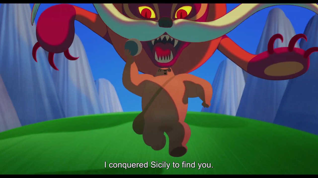 "Our story starts with Tonio, the son the bears King, being kidnapped by some hunters in the Sicilian mountains. Because of the harshness of a winter that threatens its clan with famine, the Bear King decides to invade the land of men (in the hope of finding his son). Thanks to his powerful army and the help of a wizard, he will succeed at both quests but he will soon find out that bears are not meant to live in the land of men." (Cannes Film Festival)